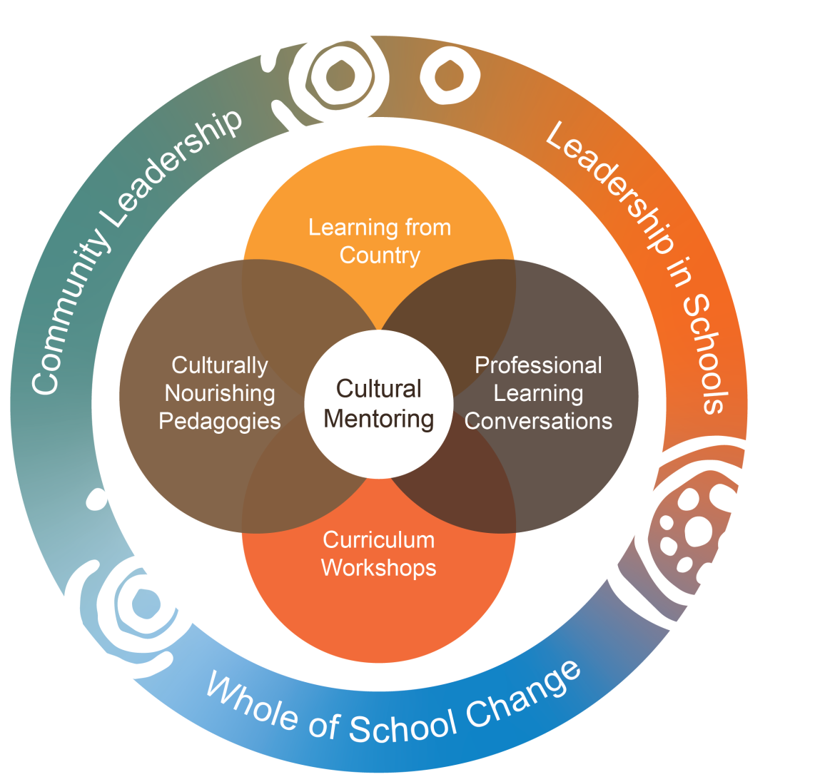 The CNS framework was developed to support the creation of a sustainable, authentic and localised approach to schooling. The framework is collaboratively implemented with local Aboriginal and Torres Strait Islander people, alongside school leaders and teachers. Our approach aims to impact all levels of schooling, to affect whole-of-school change that better supports the motivations and outcomes for Aboriginal and Torres Strait Islander students. This approach is one that sets CNS apart from other school-based initiatives.