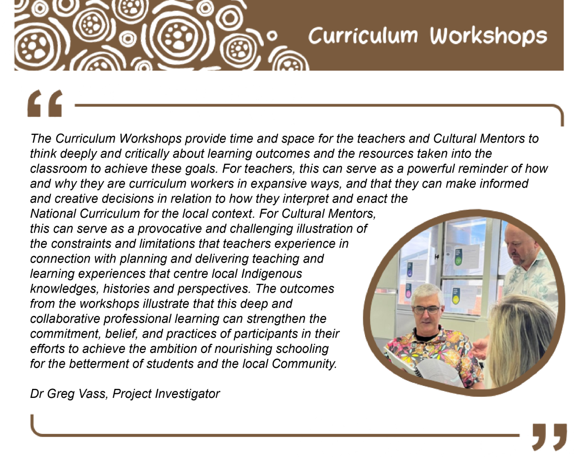 • Schools fund Cultural Mentoring through school resources, by employing new Community staff, or making arrangements with community members and Elders who support the professional learning.