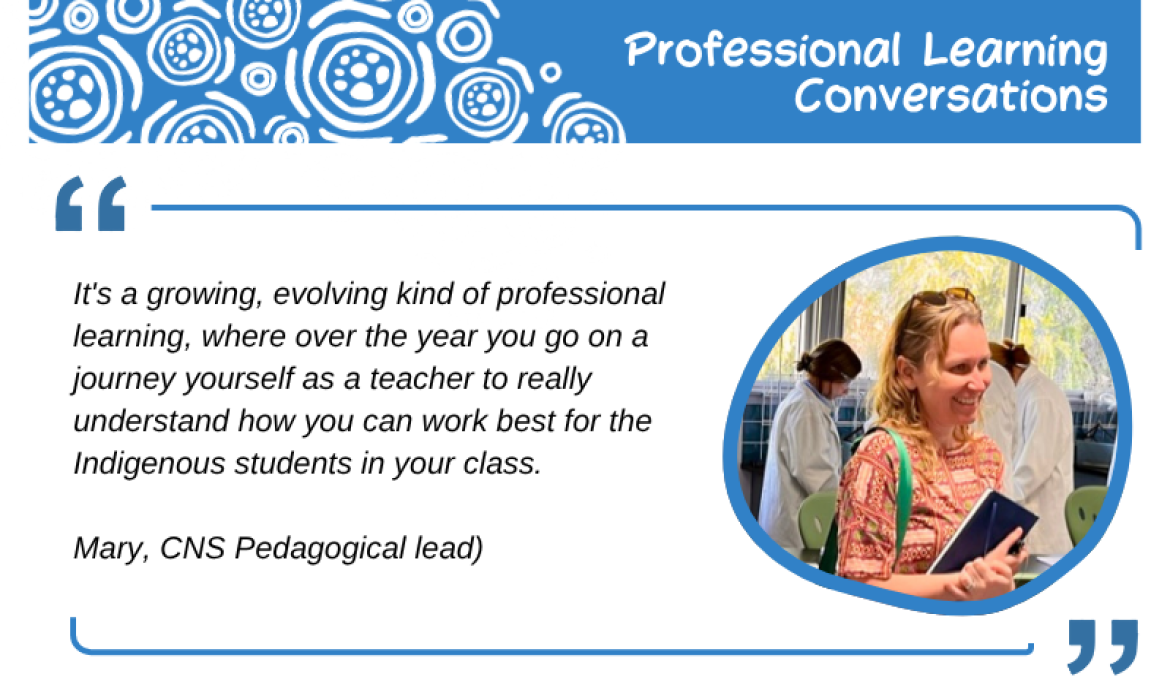 Our program was initially underpinned by five professional learning strategies that were implemented during the school’s calendar year. During the first phase of the CNS project, the schools, Aboriginal Cultural Mentors and the CNS team saw the need to expand the direct strategies to two more explicitly supported elements, namely: School Leadership and Student Voice.